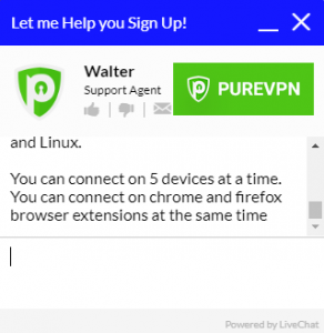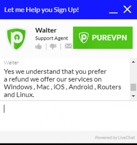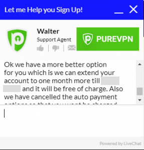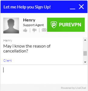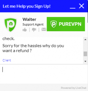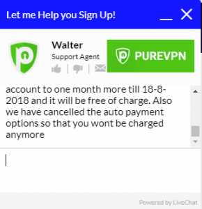 เนื่องจากฉันยังคงไม่ได้รับการยืนยันสำหรับการยกเลิกหรือคืนเงินและฉันยังคงสามารถเข้าสู่ระบบและใช้ PureVPN ได้ฉันจึงกลับไปที่แชทสดเพื่อพูดคุยโดยตรงกับตัวแทนฝ่ายบริการลูกค้า