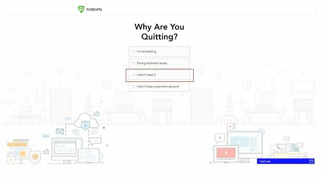 4. จากนั้นตามสไตล์ PureVPN คุณจะได้รับคำถามว่าเหตุใดคุณจึงยกเลิกการติดตั้ง ฉันเดาว่าการเลือกประเด็นที่เฉพาะเจาะจงจะนำไปสู่คำถามการแก้ปัญหาอื่น ๆ และการขายในแบบอื่นดังนั้นฉันจึงเลือกไม่จำเป็นต้องใช้