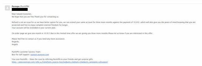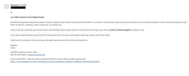 อีเมลฉบับที่สองเป็นการพยายามขายของ PureVPN และดูว่าสามารถแก้ไขปัญหาทางเทคนิคได้หรือไม่ อีเมลมีบรรทัดนี้: “ถ้าคุณตัดสินใจเลิกแล้วแจ้งให้เราทราบและฉันจะทำการยกเลิกการสมัครสมาชิกของคุณได้ทันทีโดยไม่มีการล่าช้าใด ๆ”
