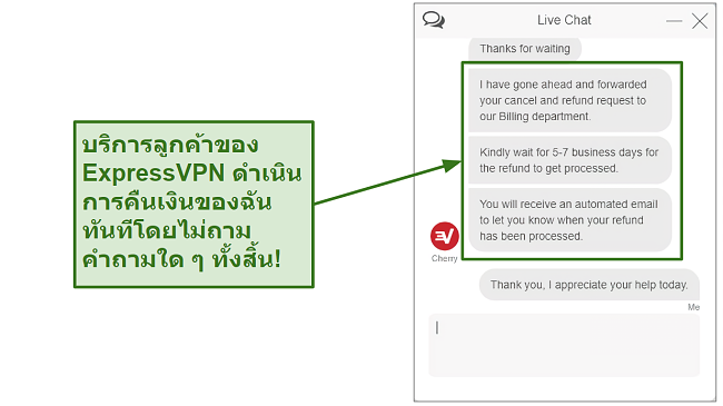 คุณสามารถทดลองใช้ฟีเจอร์ความปลอดภัยของ ExpressVPN โดยไม่มีความเสี่ยงได้ด้วยรับประกันยินดีคืนเงินภายใน 30 วันของพวกเขา คุณสามารถขอเงินคืนผ่านอีเมลหรือแชทออนไลน์ได้อย่างง่ายดายโดยไม่ต้องตอบคำถาม! ฉันทดสอบมันแล้วและได้รับเงินคืนกลับมาอย่างง่ายดายมาก ๆ